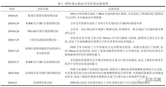 STSS主要功能是在戰(zhàn)區(qū)沖突和針對(duì)美國(guó)的導(dǎo)彈攻擊防御中,為導(dǎo)彈防御任務(wù)提供精確的中段跟蹤和識(shí)別能力,STSS目前還未直接參與攔截試驗(yàn),但具有針對(duì)彈道導(dǎo)彈飛行全過(guò)程的監(jiān)視與跟蹤能力,能夠探測(cè)到中段目標(biāo)在跨越陽(yáng)光與陰影區(qū)飛行中的溫度變化,甚至可以觀測(cè)到誘餌釋放、膨脹及展開(kāi)過(guò)程的特性變化。STSS基本功能還包括:能對(duì)全球范圍內(nèi)的導(dǎo)彈發(fā)射進(jìn)行監(jiān)視;能提供精確、及時(shí)的導(dǎo)彈發(fā)射時(shí)間和地點(diǎn)估計(jì);能同時(shí)對(duì)多個(gè)彈道目標(biāo)進(jìn)行精確跟蹤與監(jiān)視;具有分辨彈頭和誘餌的能力,并獲得彈頭的位置、速度和加速度等狀態(tài)信息;能估計(jì)導(dǎo)彈攻擊的準(zhǔn)確時(shí)間和地點(diǎn);能夠精確引導(dǎo)地面雷達(dá)捕獲來(lái)襲導(dǎo)彈和彈頭,使地面雷達(dá)在對(duì)方導(dǎo)彈進(jìn)入其作用范圍時(shí)才開(kāi)始工作,可以減少來(lái)自反輻射導(dǎo)彈的威脅等;此外STSS還兼具技術(shù)情報(bào)收集、戰(zhàn)場(chǎng)空間特征描述等多種功能,為彈道導(dǎo)彈防御作戰(zhàn)提供有力的情報(bào)支持和技術(shù)保障。STSS演示驗(yàn)證衛(wèi)星在軌試驗(yàn)成果見(jiàn)表3。