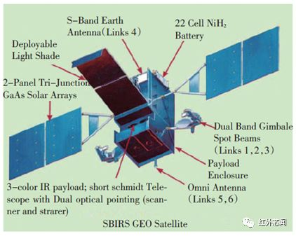 (2)眼鏡蛇響聲(CB)計(jì)劃:為提高DSP衛(wèi)星探測(cè)能力,要求研制一種新型的紅外遙感器,以代替DSP衛(wèi)星上使用的雙波段探測(cè)器。改進(jìn)之處有:采用3個(gè)焦平面,通過(guò)濾光片旋轉(zhuǎn)實(shí)現(xiàn)波段快速切換;采用快速掃描成幀技術(shù);提高儀器的靈敏度;采用高速星上存儲(chǔ)器。該計(jì)劃于1995年歸人SBIRS計(jì)劃,新研制的紅外探測(cè)器也將用于高軌天基紅外系統(tǒng)衛(wèi)星上。