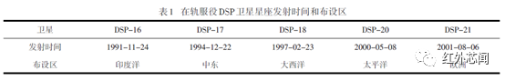 DSP衛(wèi)星星座布設(shè)在地球靜止軌道上,由5顆衛(wèi)星組成,4顆為工作星,1顆為備份星(以在必要時(shí)隨時(shí)替換)。DSP衛(wèi)星分布在全球各大洲上空,如表1所示。