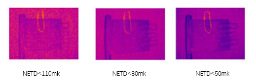 1.熱靈敏度決定紅外熱像儀區(qū)分細(xì)微溫差的能力。在不同熱靈敏度下,呈現(xiàn)的圖片效果也截然不同,靈敏度的數(shù)值越小,代表熱靈敏度越好,圖片越清晰。