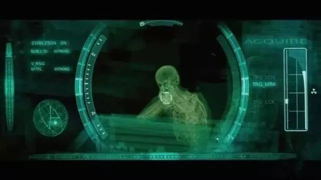 反派手握重型武器懟他進(jìn)行掃射的時(shí)候,出現(xiàn)了很多透視的鏡頭。但其實(shí)這里運(yùn)用的并不是純粹的紅外熱像技術(shù),因?yàn)榧t外熱像不可能把人透視到如電影鏡頭中出現(xiàn)的這樣骨頭分明,這更像是紅外和多種技術(shù)融合之后的效果。