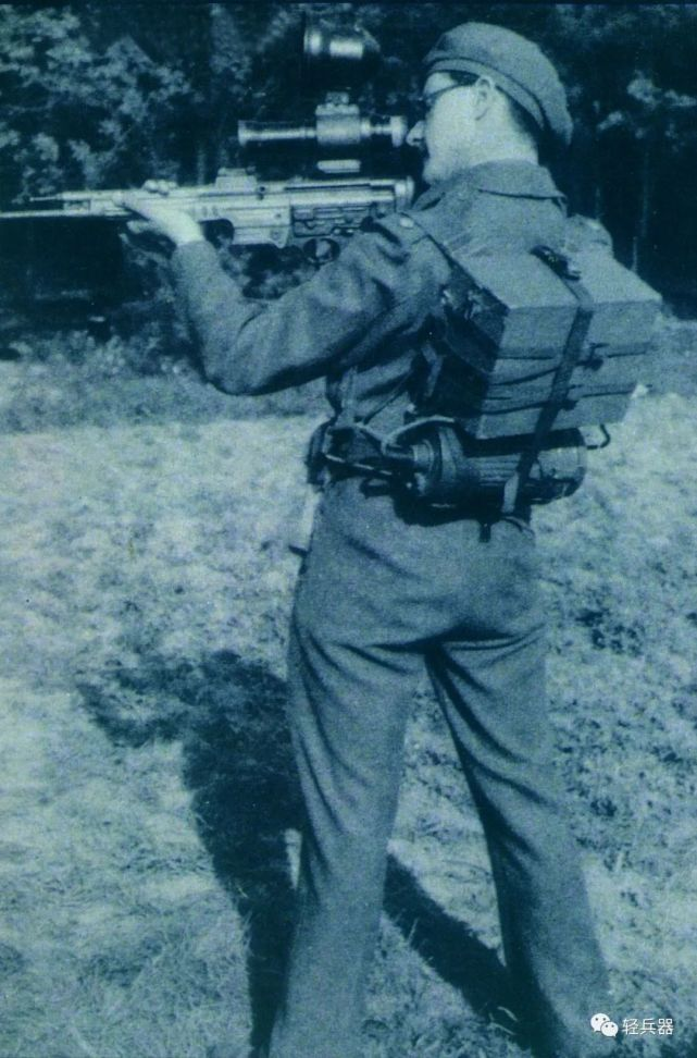 ZG 1129吸血蝠(ZG為瞄準(zhǔn)裝置的德文首字母縮寫)裝置 這是一個加裝在MP44突擊步槍上使用的瞄準(zhǔn)裝置。該裝置的發(fā)射器為一個35瓦的照射燈,其直徑127mm,而接收器則是一個具有放大功能的望遠(yuǎn)鏡,其長約為356mm,直徑64mm。發(fā)射器和接收器總質(zhì)量約2.3kg,兩者一起安裝在突擊步槍上使用。發(fā)射器和接收器采用外部電源供電,該電源質(zhì)量約為13.6kg,收納在一個背包中攜帶,充電一次可持續(xù)工作3~5小時。