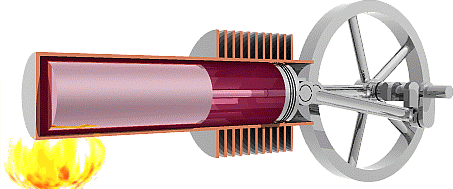 圖:斯特林機(jī)的原理動圖,通過外部加熱,迫使“熱腔/膨脹腔”內(nèi)的氣體膨脹,推動活塞向“冷腔/壓縮腔”運(yùn)動。活塞的往復(fù)循環(huán)最終轉(zhuǎn)化為旋轉(zhuǎn),帶動電機(jī)發(fā)電。