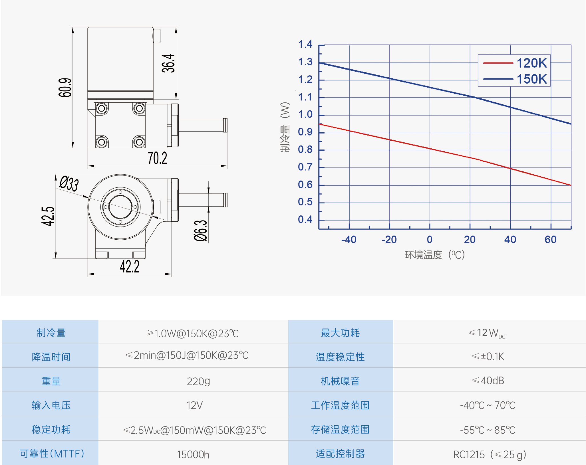 H106M微型低功耗制冷機(jī)是為適配高工作溫度探測(cè)器(HOT)組件開發(fā)的一款新產(chǎn)品,按照集成式杜瓦/制冷組件(IDCA)概念設(shè)計(jì)。極小的體積和重量、極高的效率、極低的功耗與噪音,高可靠性。產(chǎn)品已實(shí)現(xiàn)批量化生產(chǎn),特別適用于手持熱像儀、無(wú)人機(jī)等場(chǎng)合。